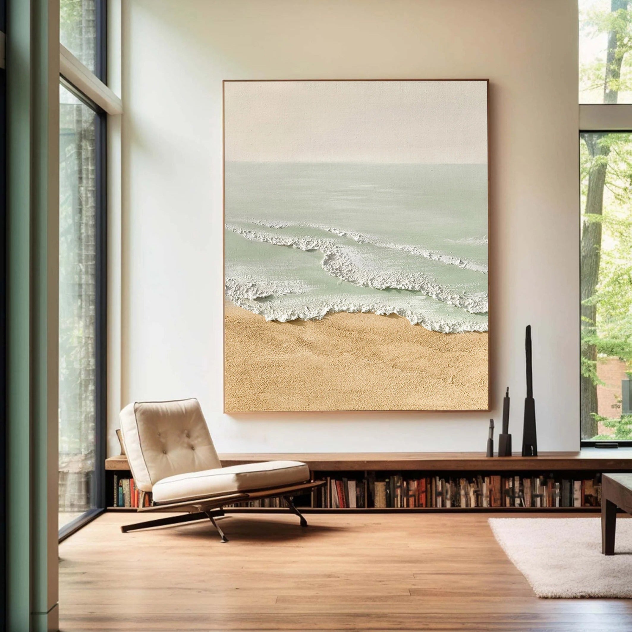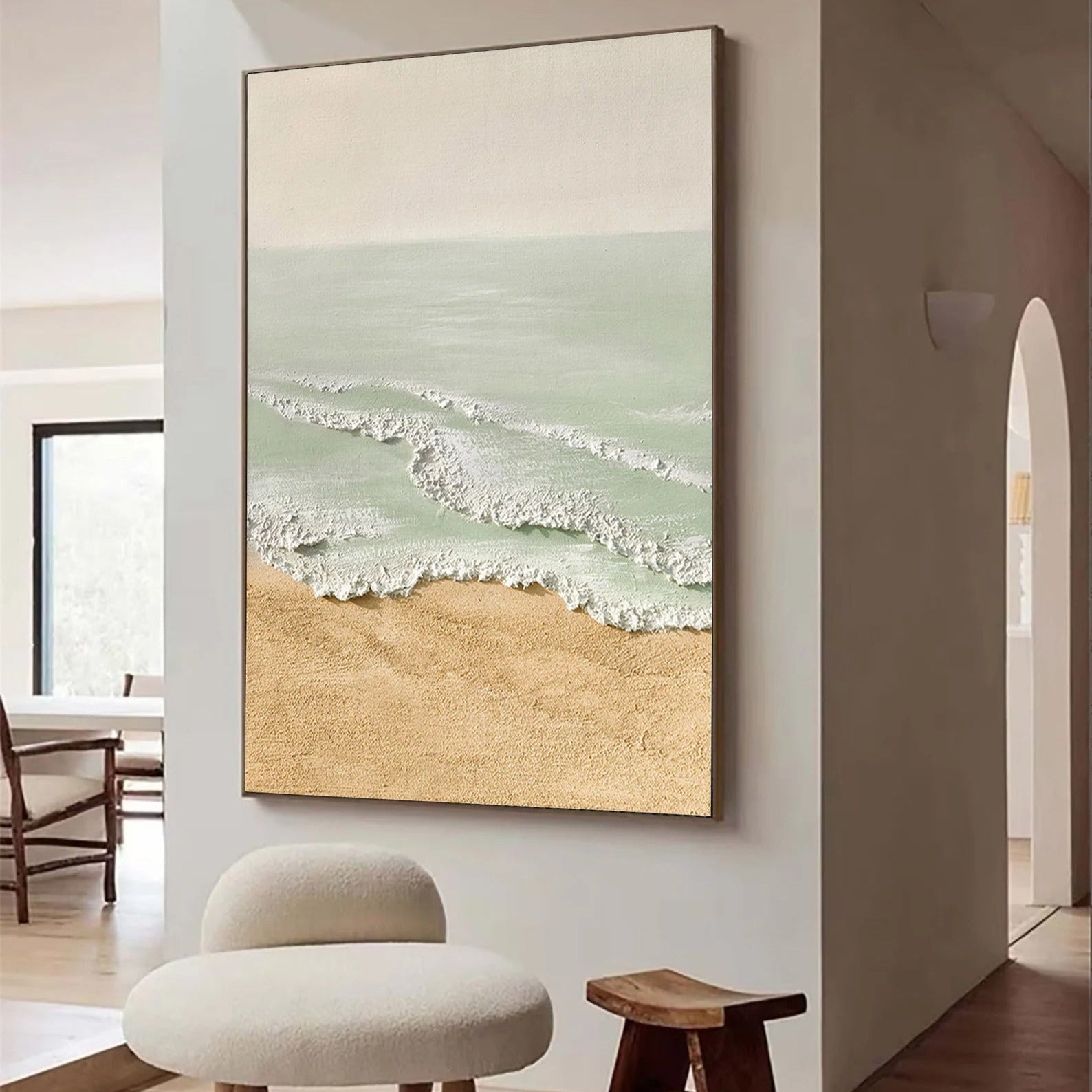 Experience the calm rhythm of the shoreline with Celadon Currents, a textured abstract seascape that captures the meeting of ocean waves and golden sand. The layered canvas reveals sculptural ridges and flowing forms, evoking the endless motion of tides shaped by wind and time.