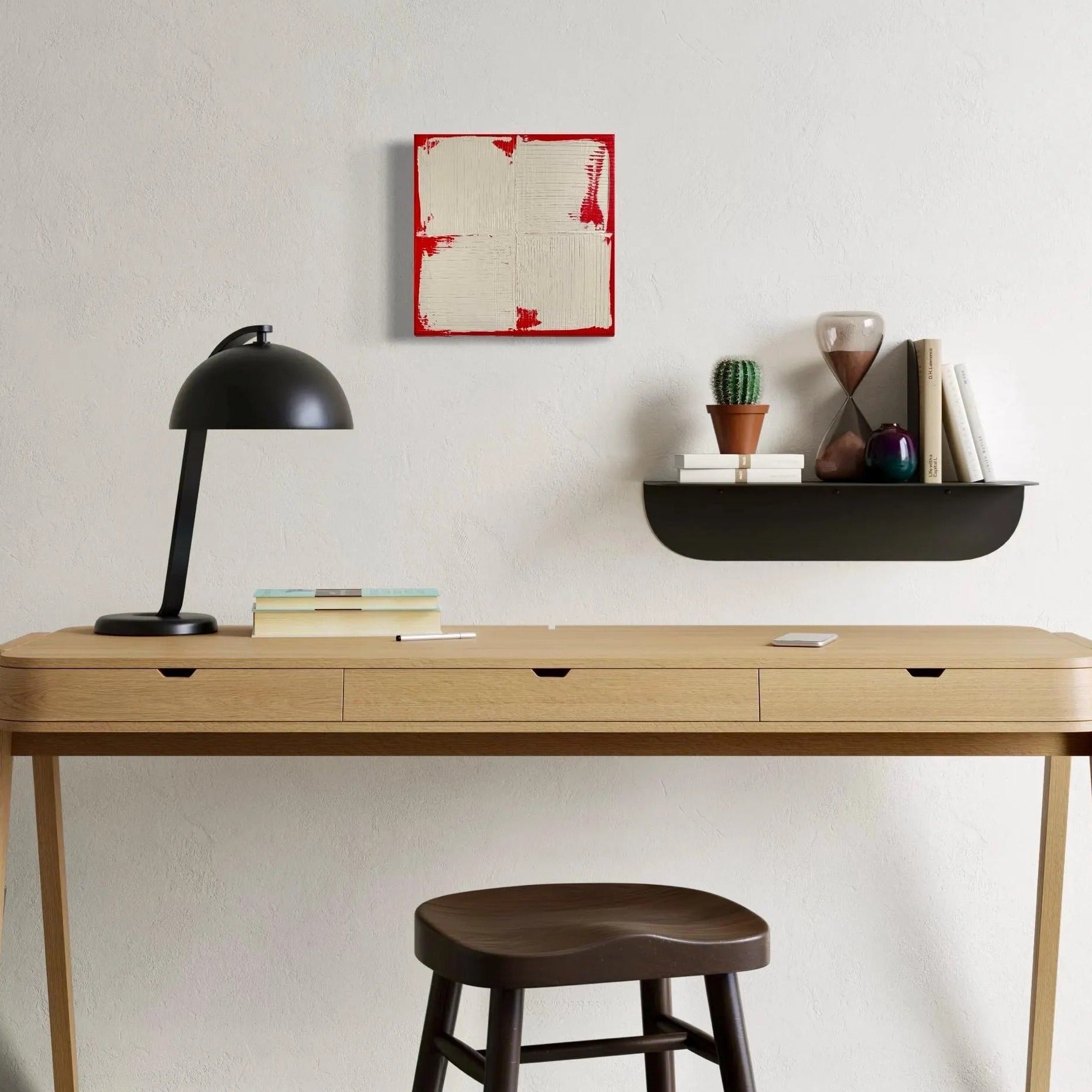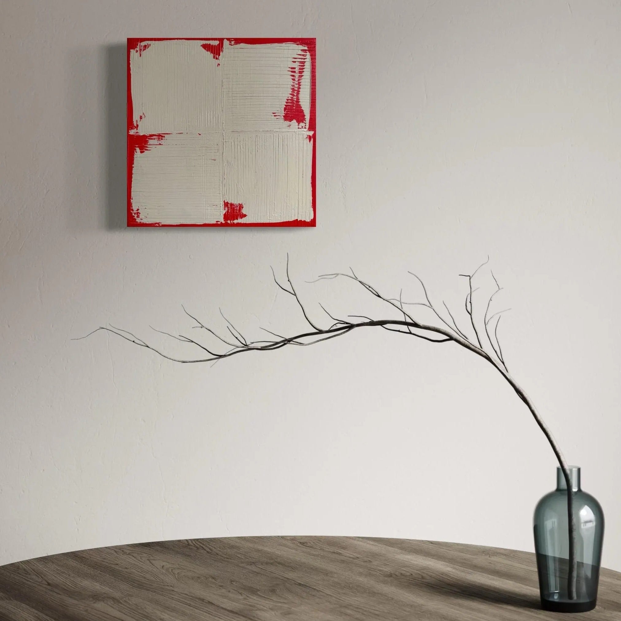Crimson Framework is a bold study of contrast and restraint — where clean geometry meets raw emotion. The hand-textured beige layers rise against the vivid red foundation, creating a sense of calm tension that feels both architectural and deeply human.