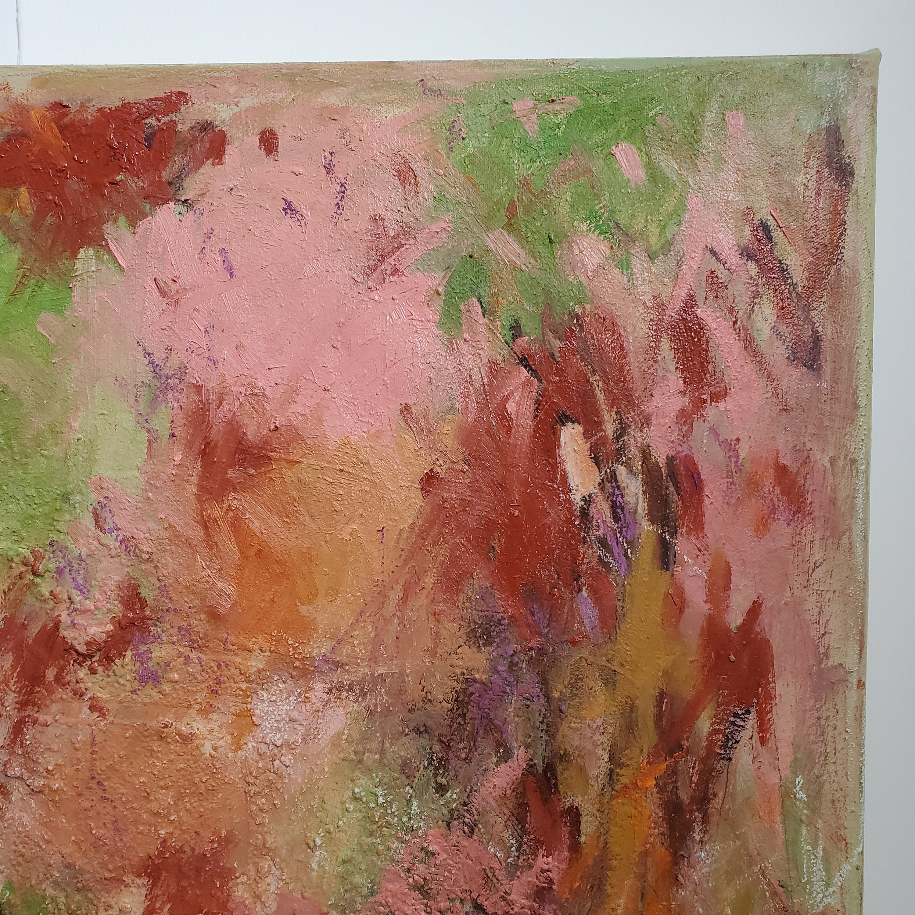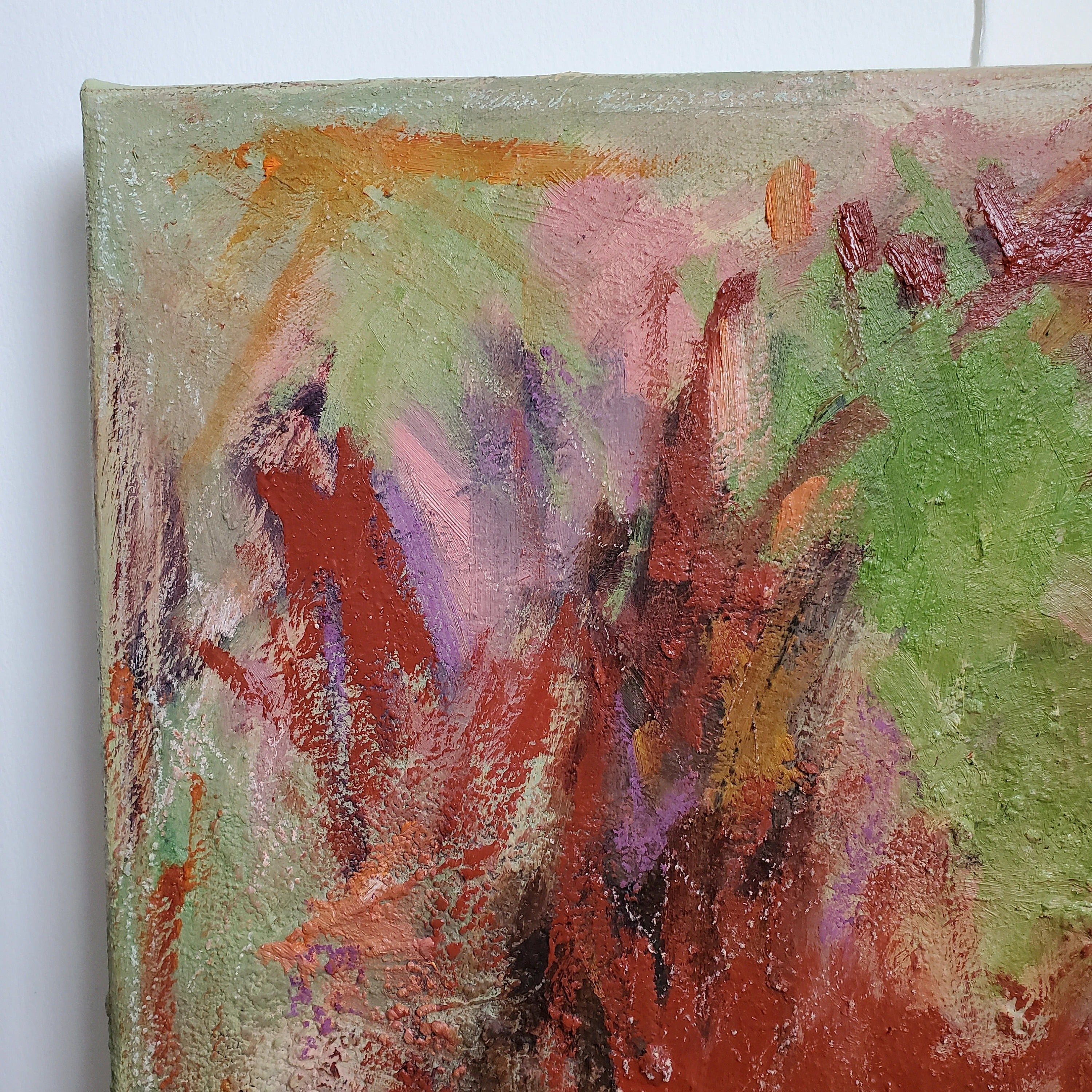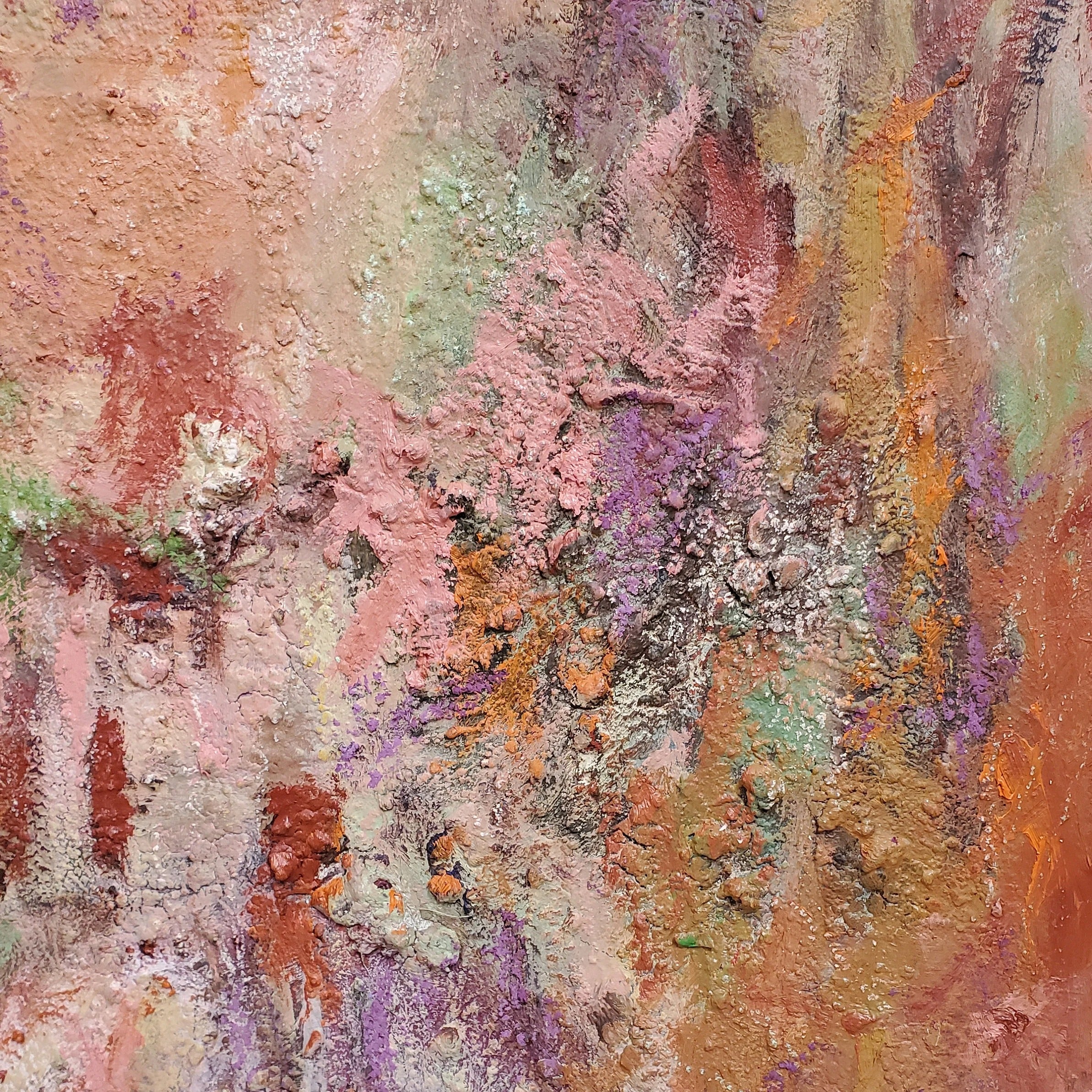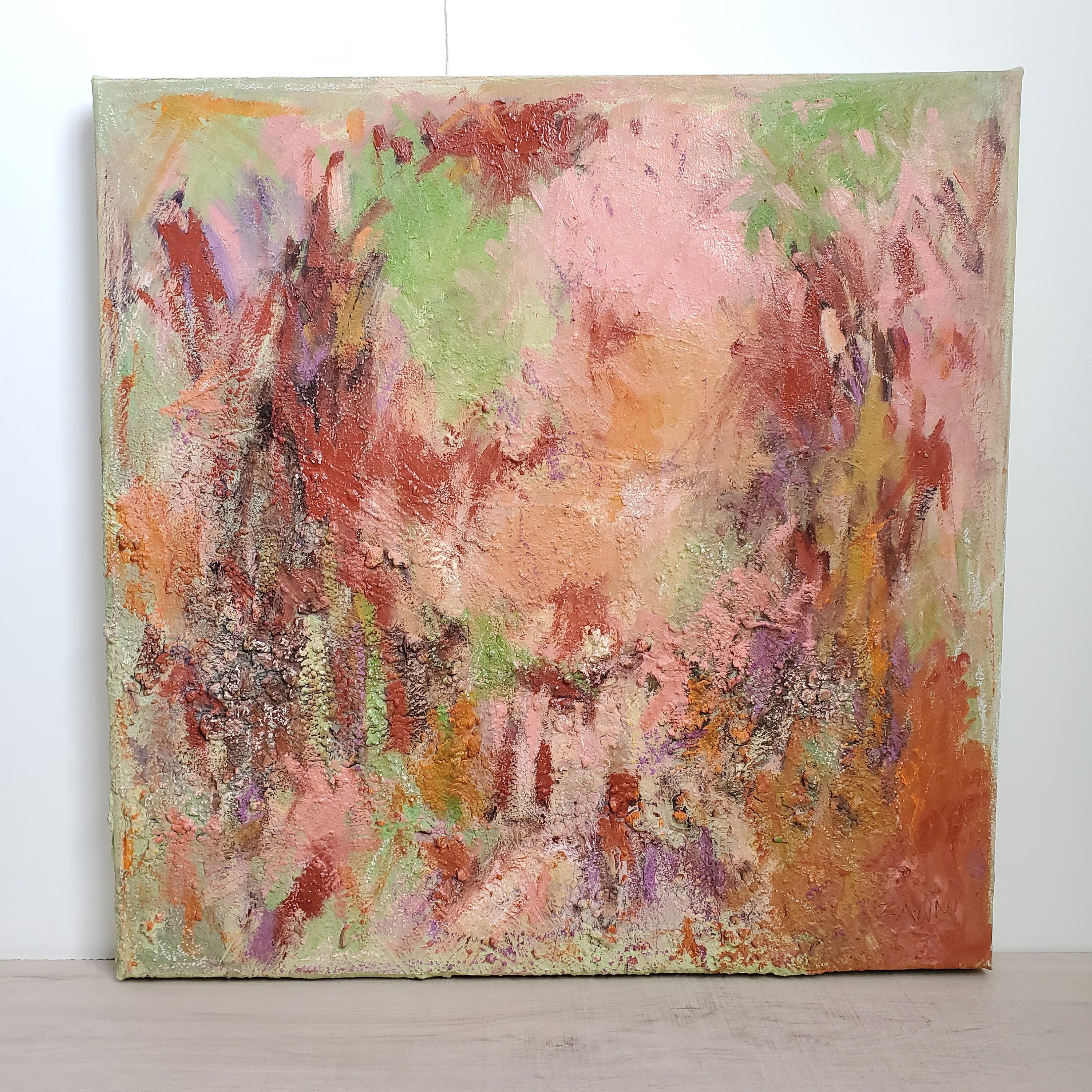 Bring the first light of day into your living space with Fields of Dawn, a textured abstract oil canvas where coral, rose, and pale green tones awaken the senses. The palette suggests both the warmth of sunrise and the freshness of open fields.