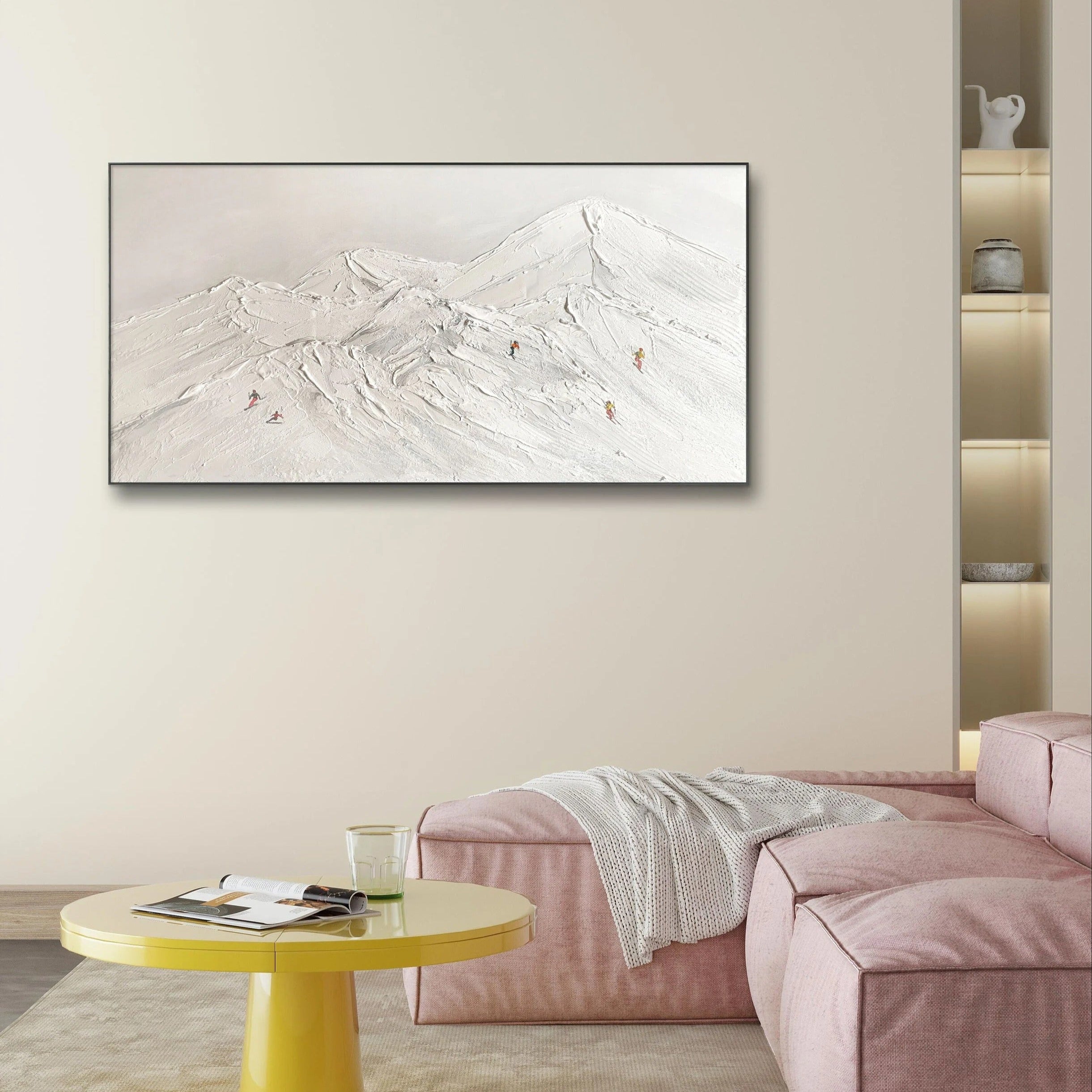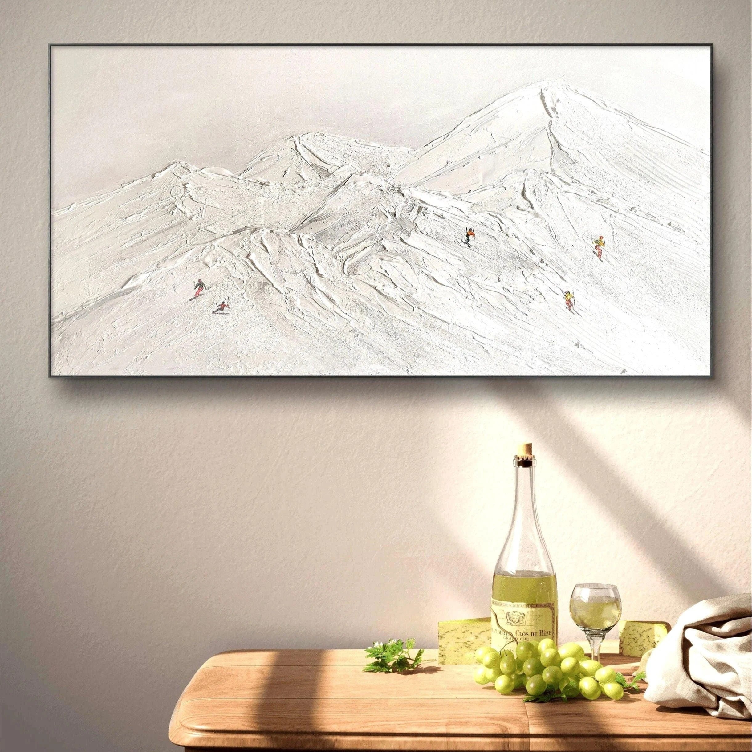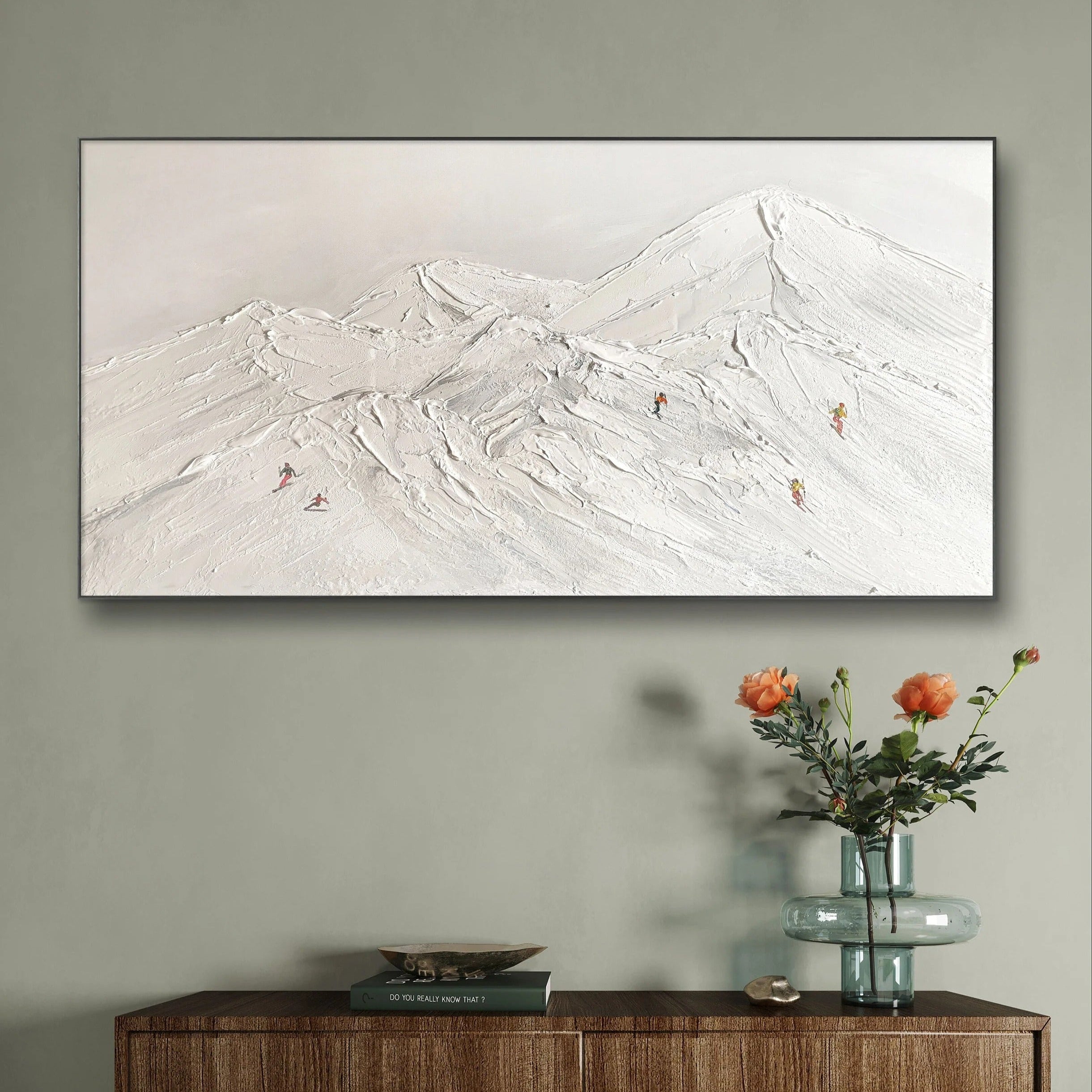 Experience the thrill of winter captured in art with Frostline Journey, a textured abstract mountain painting that blends minimalist design with playful detail. The sculpted white canvas evokes the vastness of snow-covered peaks, while tiny hand-painted skiers add a touch of motion and life, transforming the scene into a dynamic winter landscape.