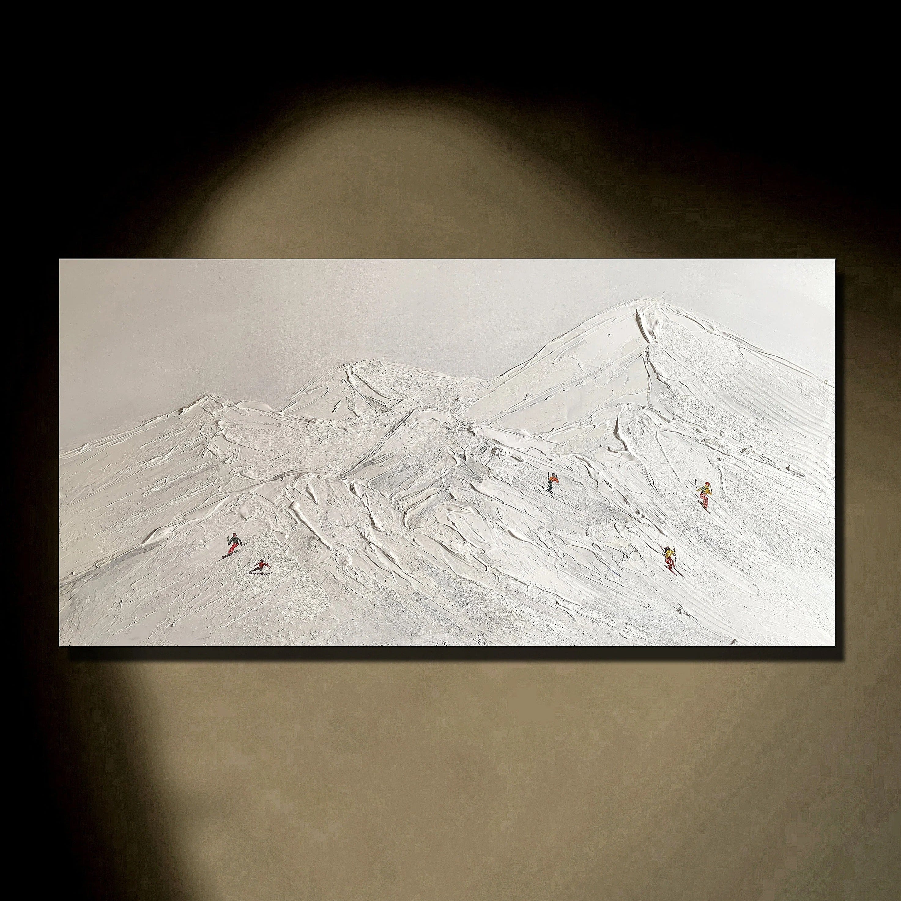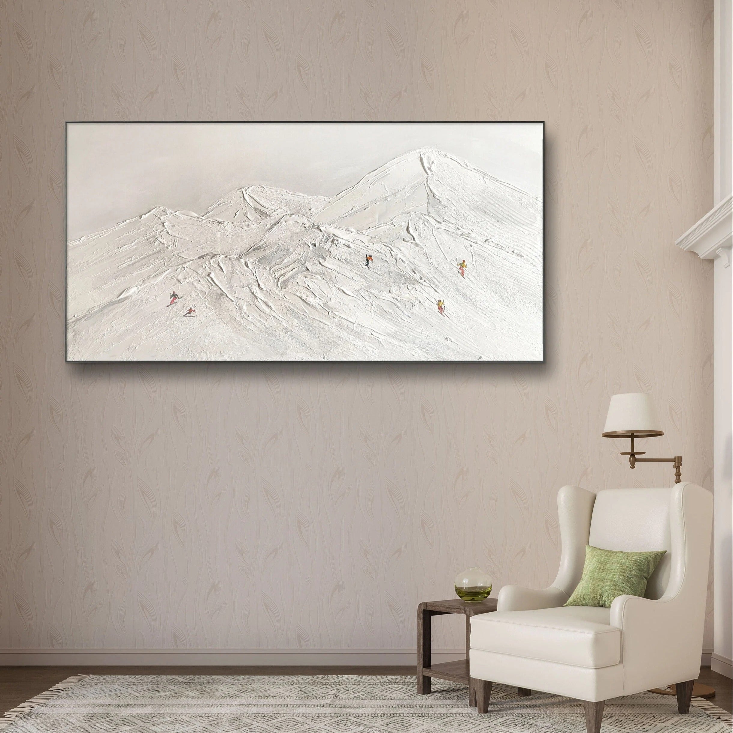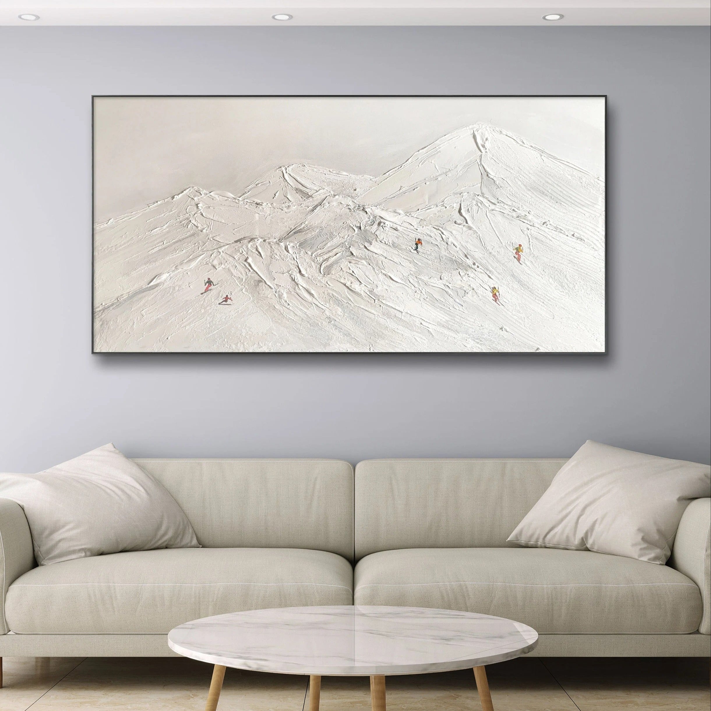 Experience the thrill of winter captured in art with Frostline Journey, a textured abstract mountain painting that blends minimalist design with playful detail. The sculpted white canvas evokes the vastness of snow-covered peaks, while tiny hand-painted skiers add a touch of motion and life, transforming the scene into a dynamic winter landscape.