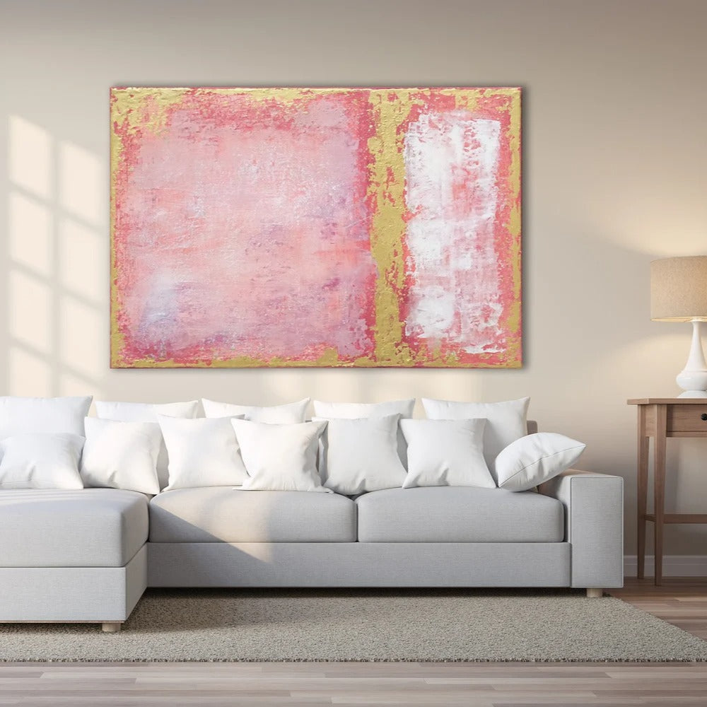 Hand-painted with textured details on premium canvas, this artwork blends minimalism with a luxurious edge. Its glowing pink and golden hues make it a perfect centerpiece for modern, chic, or classical-inspired interiors.