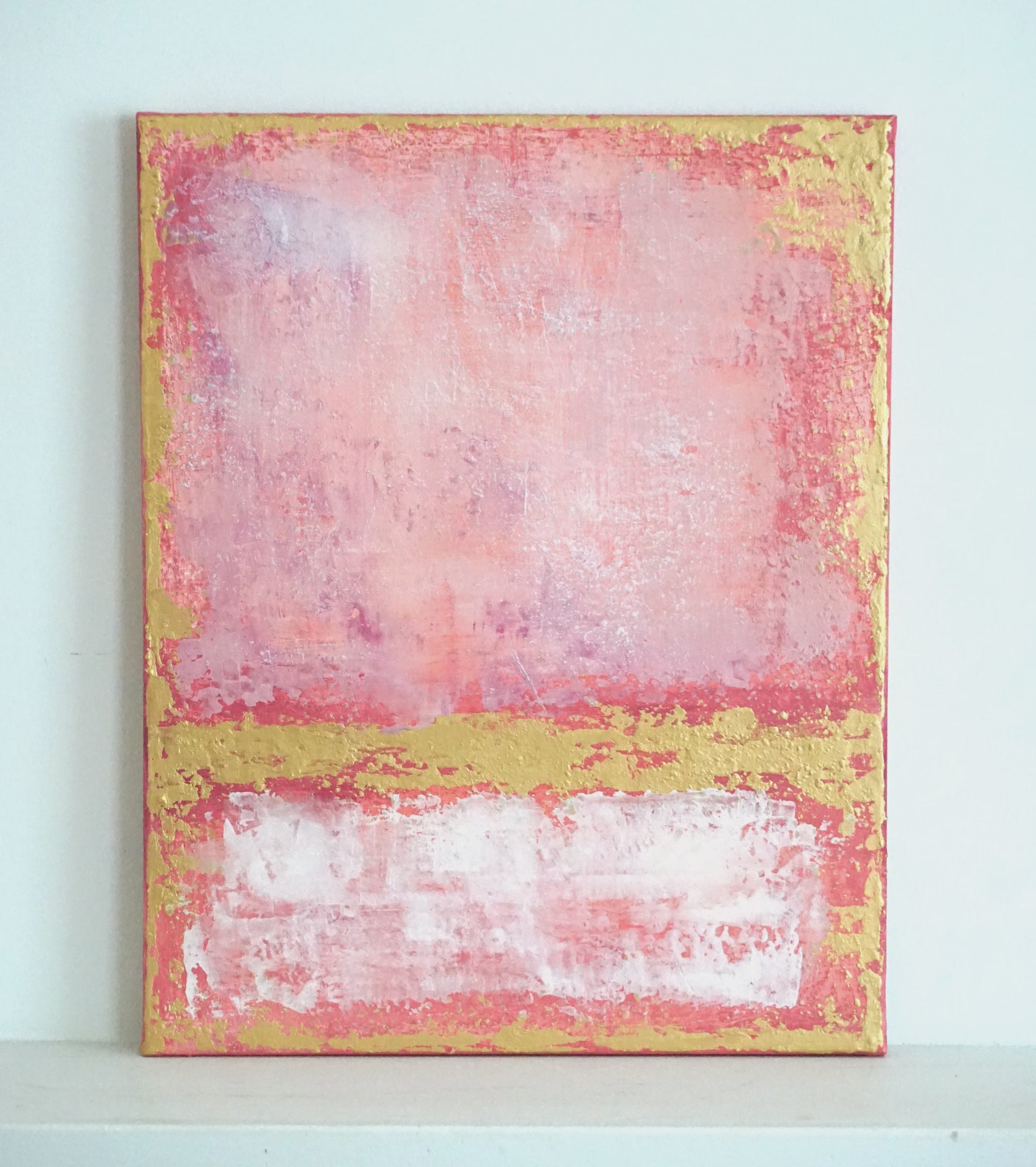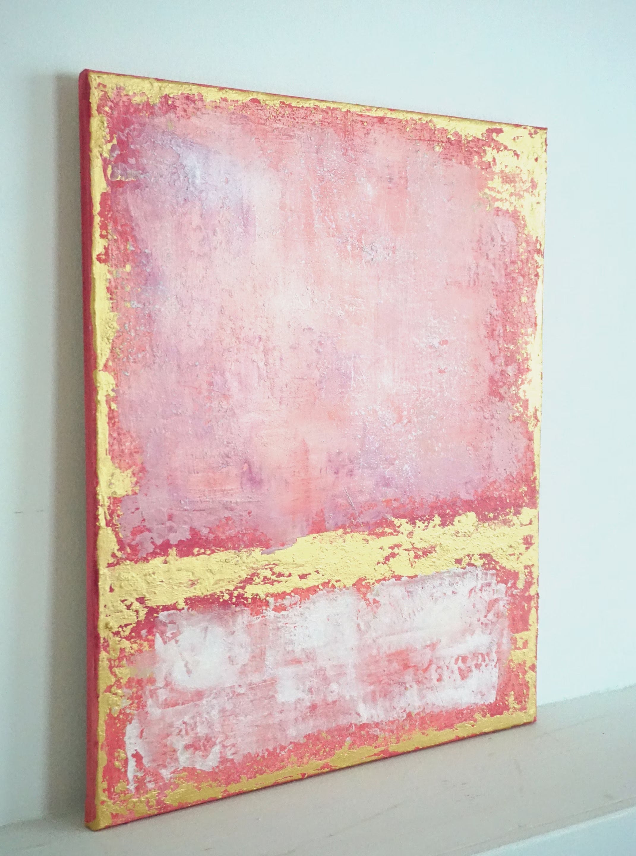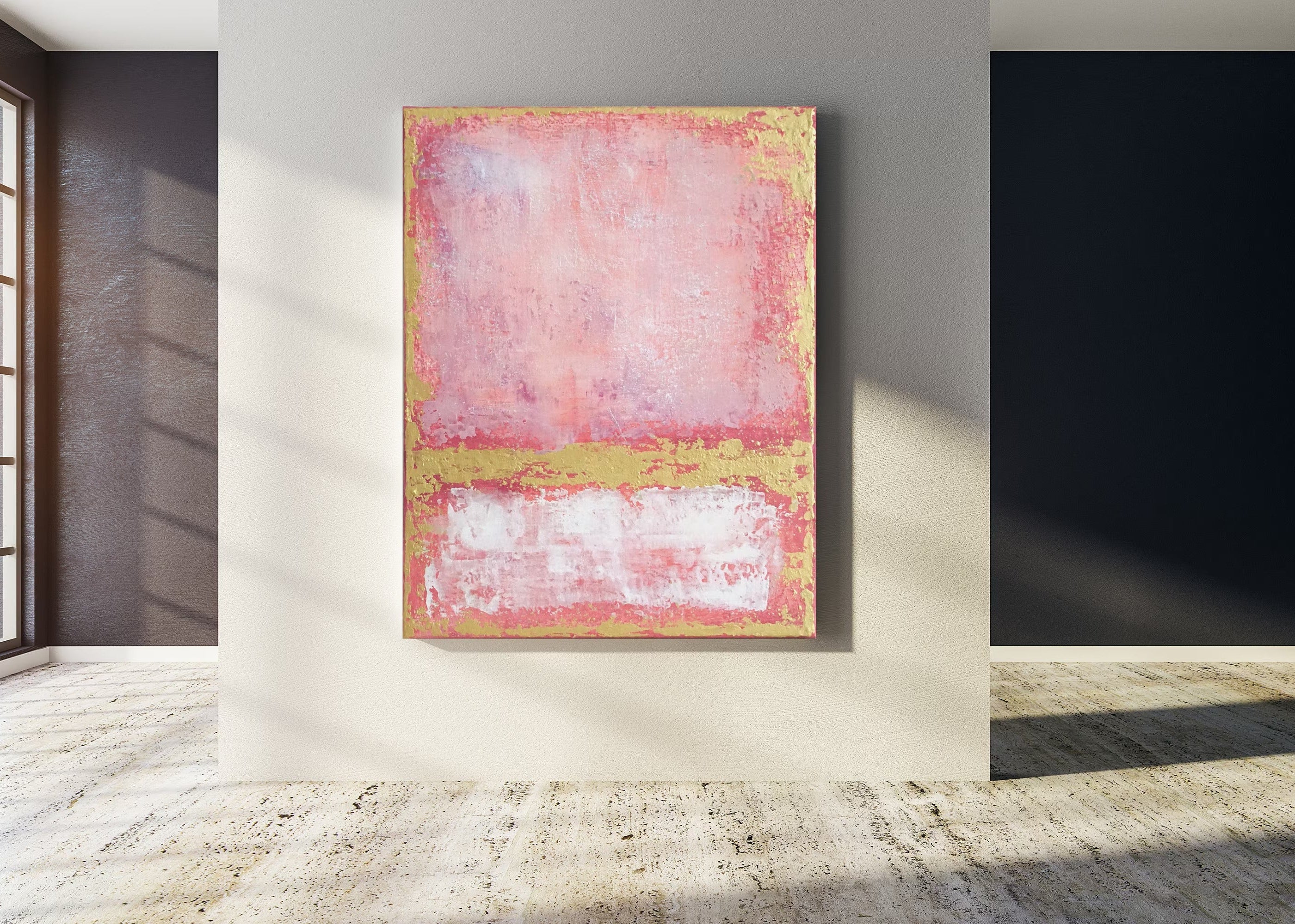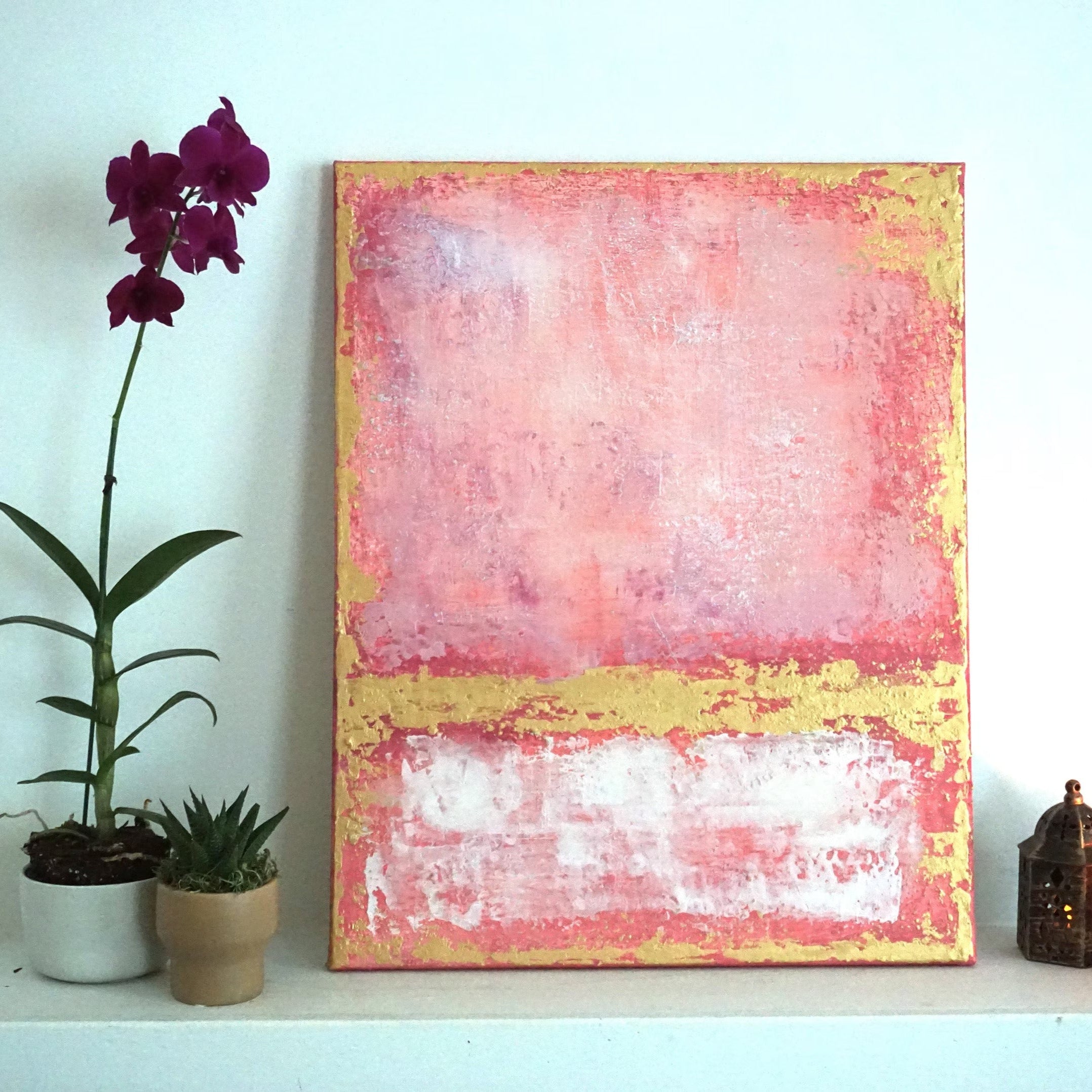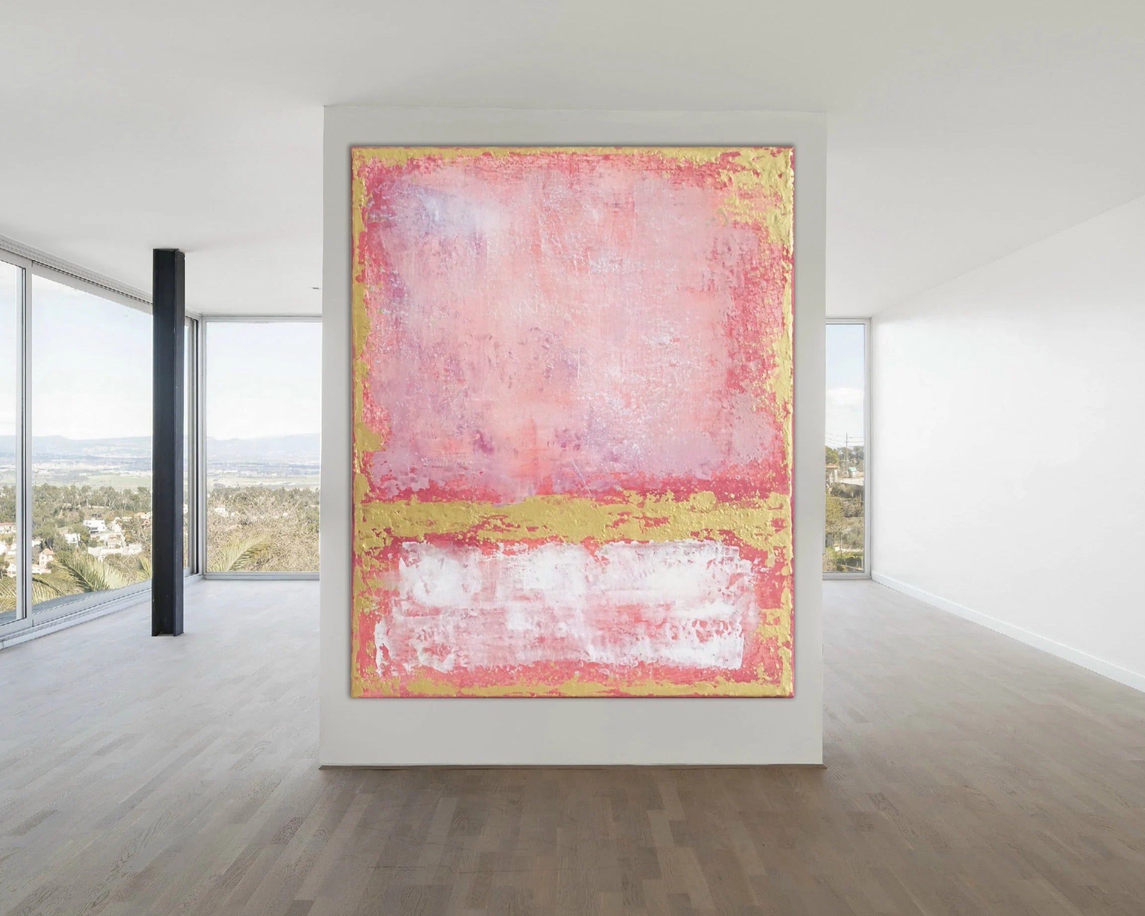 Transform your interior with Saffron Veil, a statement abstract painting that fuses soft rose tones with radiant touches of gold. The layered composition evokes both warmth and elegance, creating an atmosphere of refined sophistication.