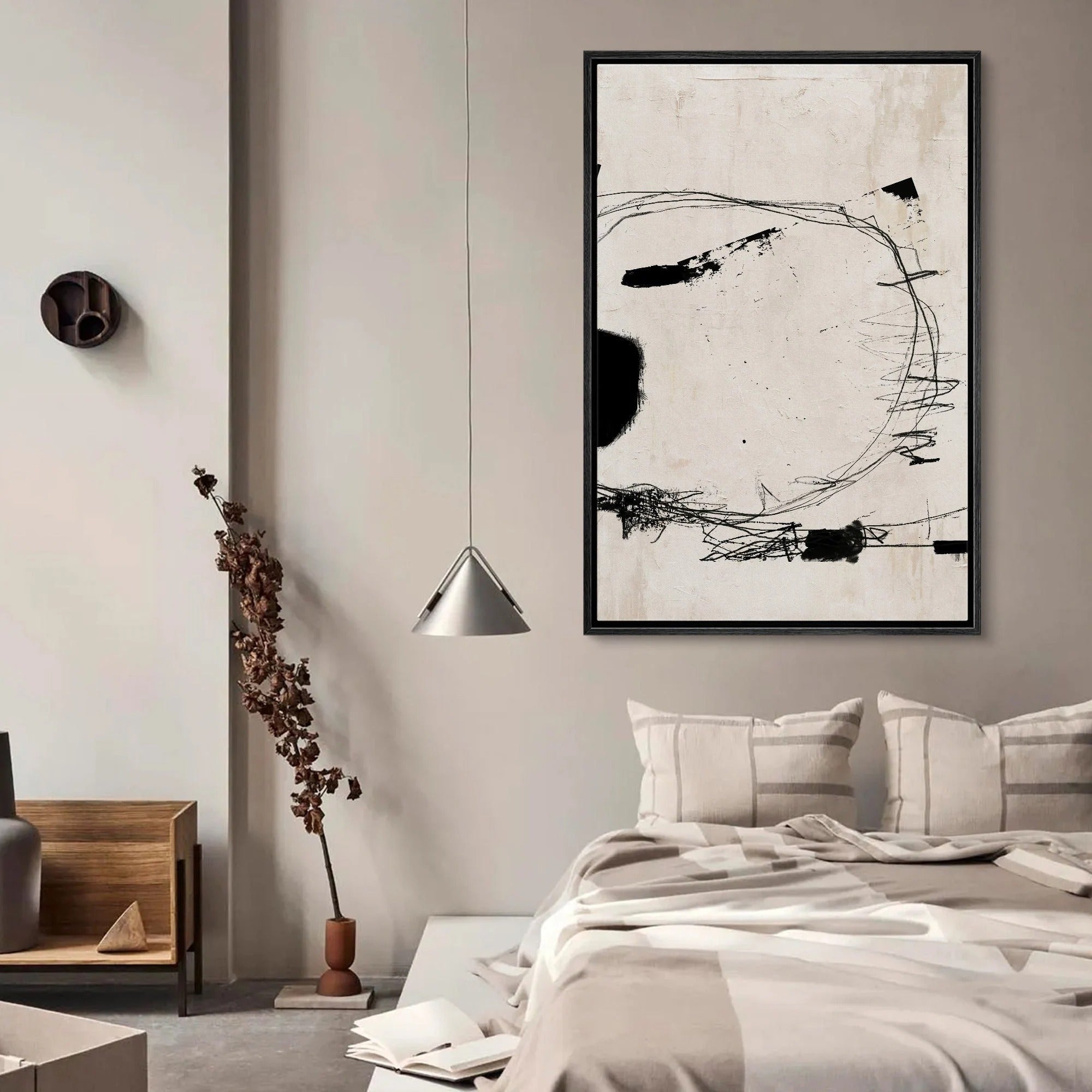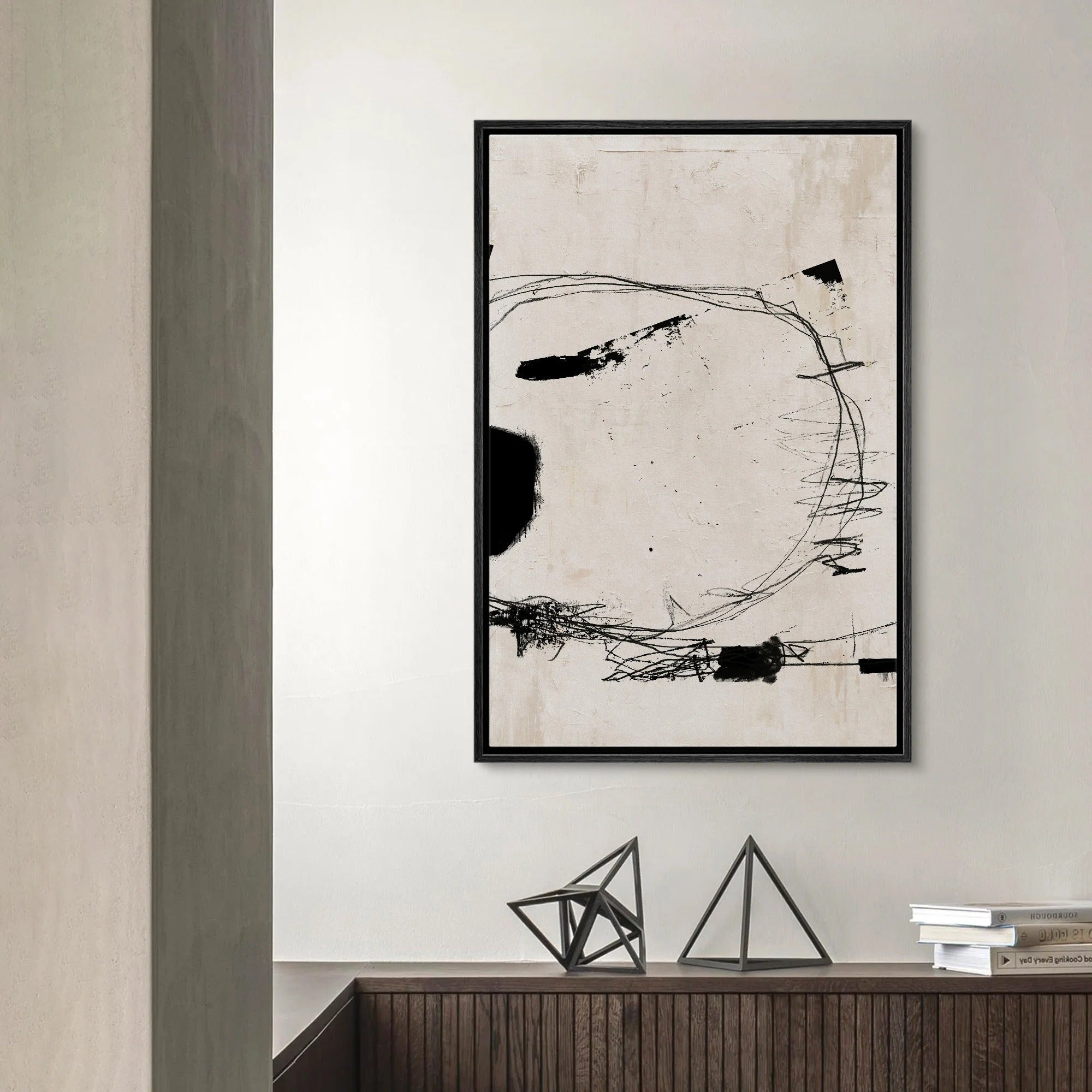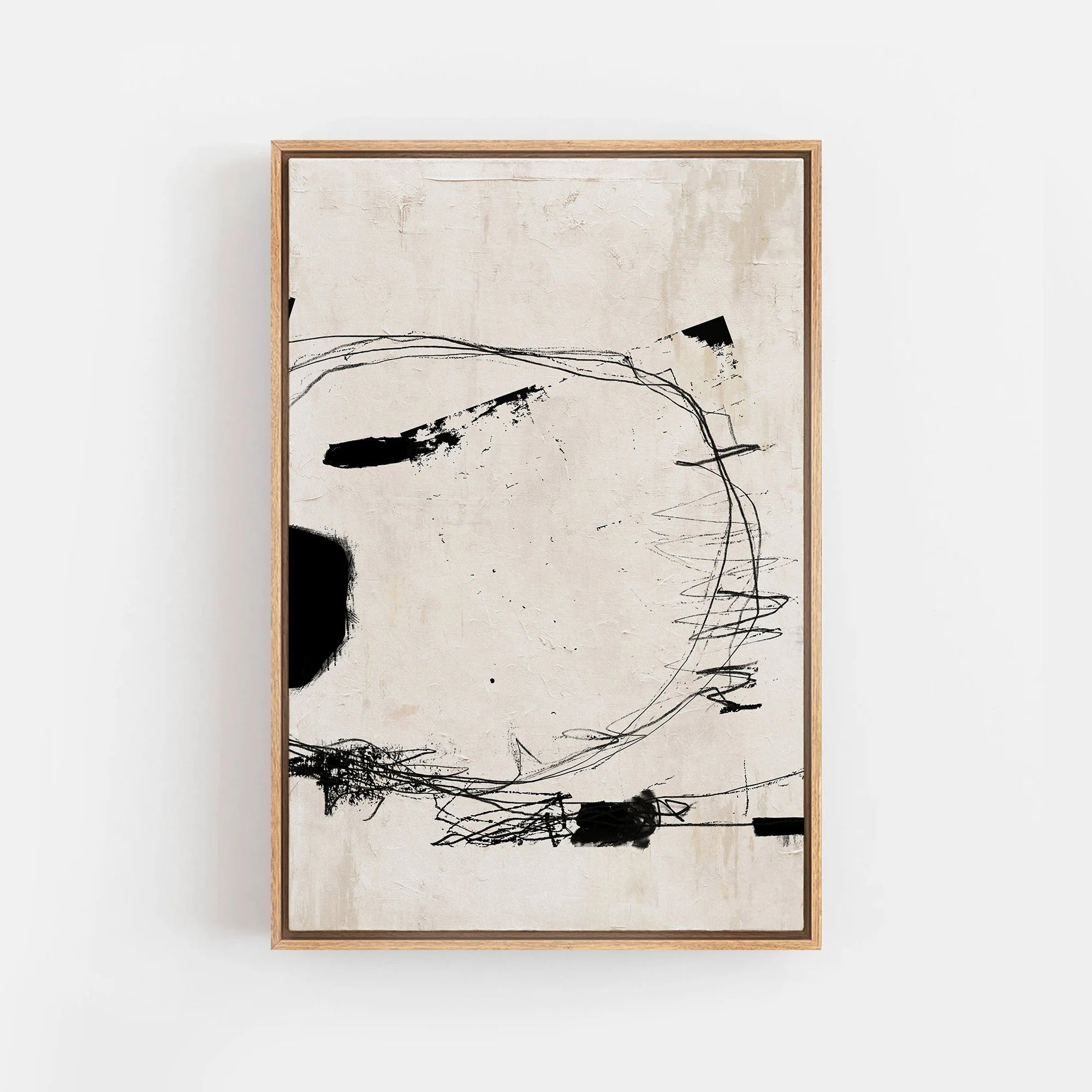 Saltwind Diagram resonates with the quiet energy of minimal abstraction — a framed art piece where bold gestures and soft neutral tones create a rhythmic dialogue across the canvas. The interplay of stark lines and organic shapes evokes a sense of movement held within stillness.