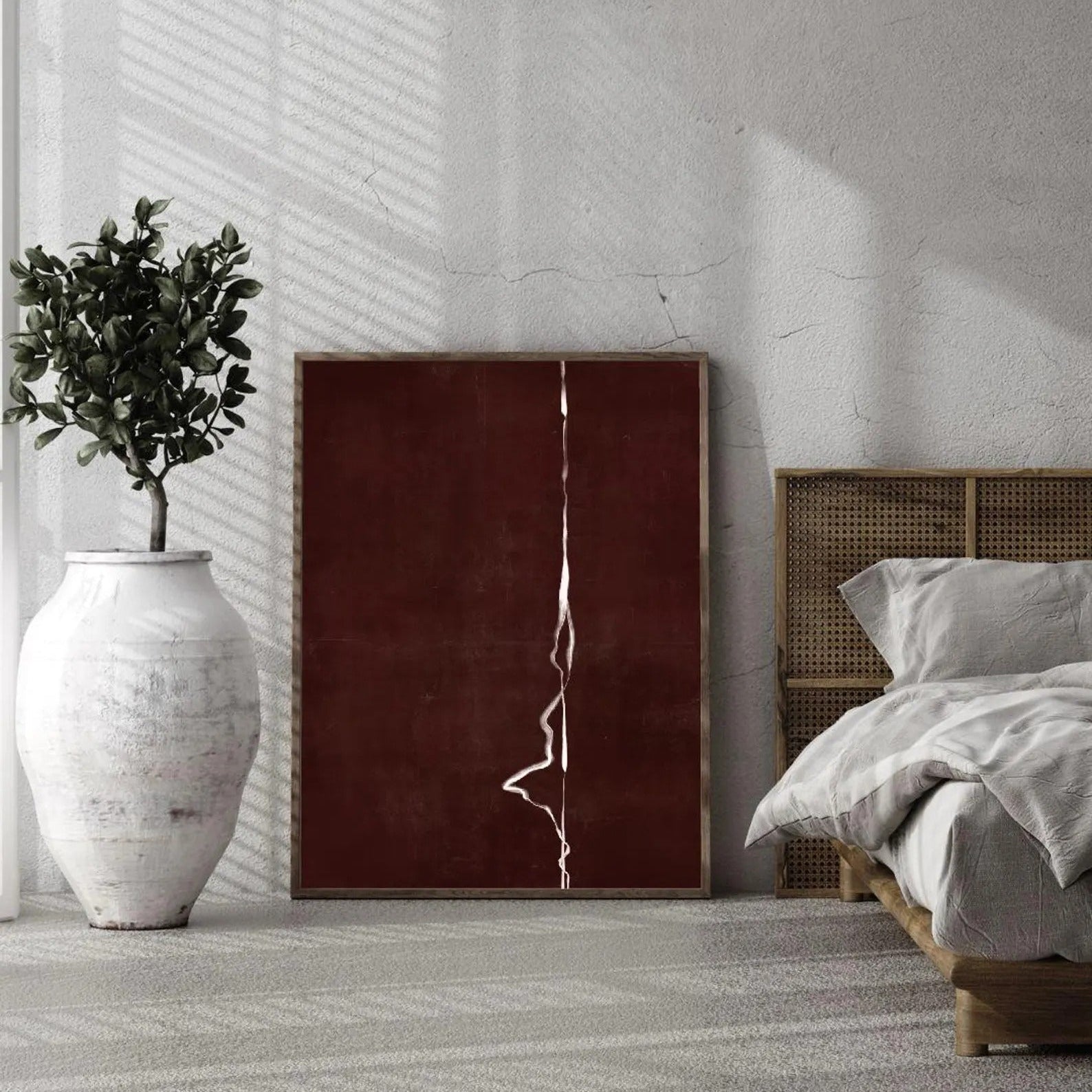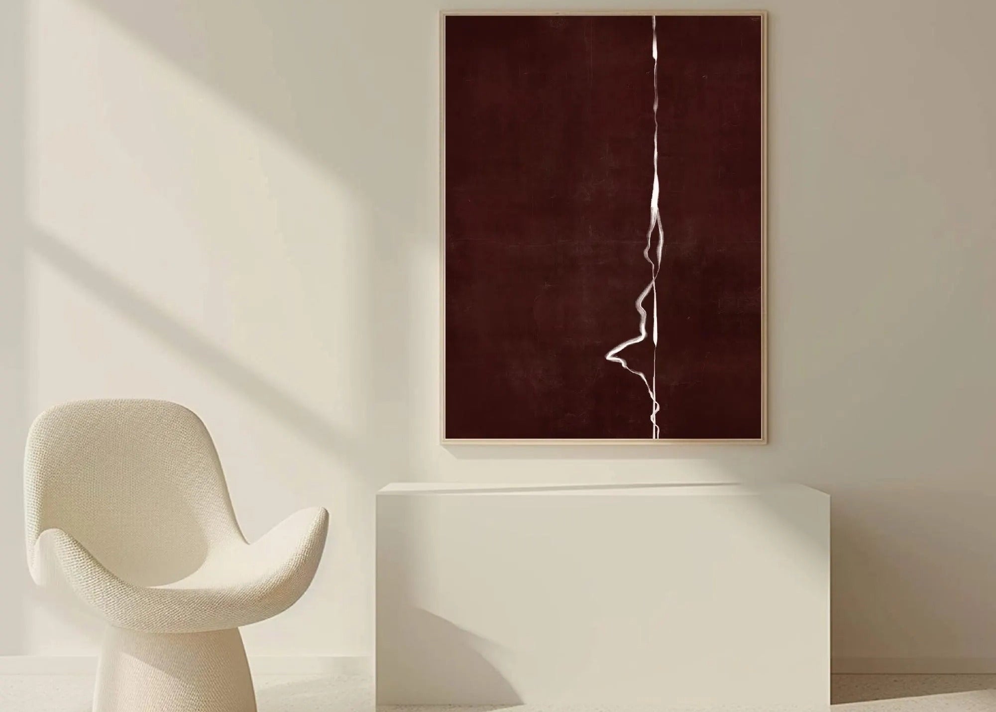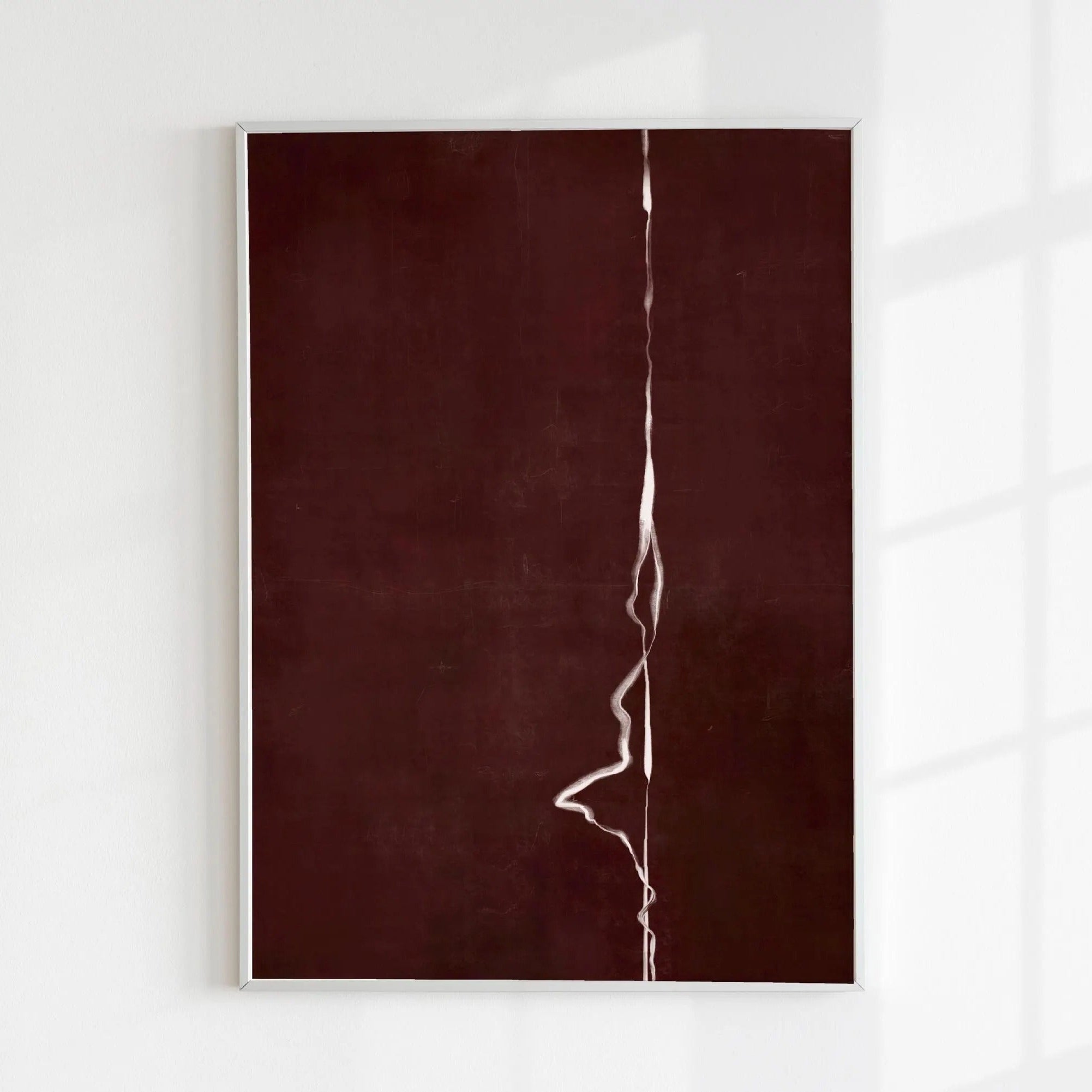 Crimson Fracture captures the raw beauty of imperfection — a hand-textured abstract canvas where deep burgundy tones meet soft white fissures. The delicate crack lines evoke the quiet erosion of time, turning flaw into form and silence into story.